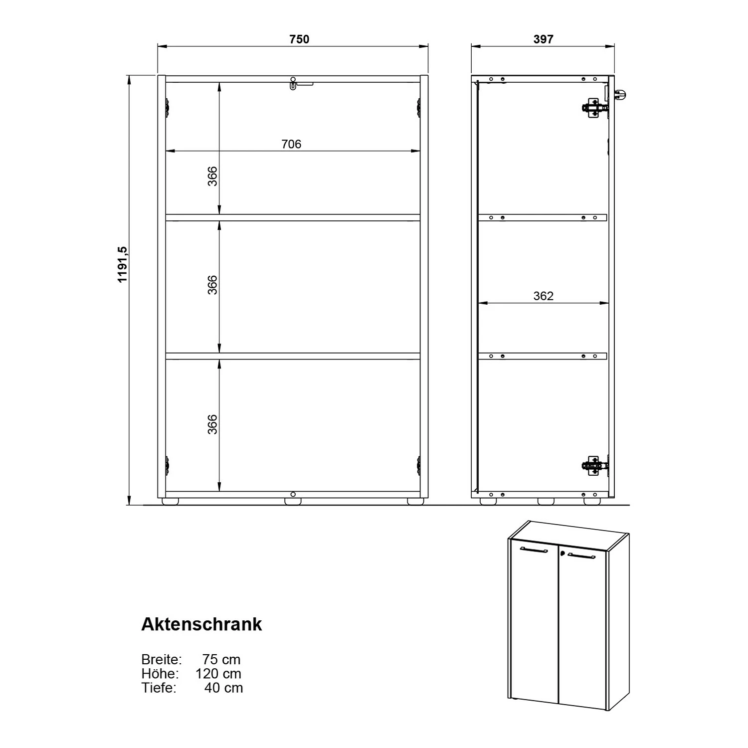 - Aktenschrank: 75 x 120 x 40 cm