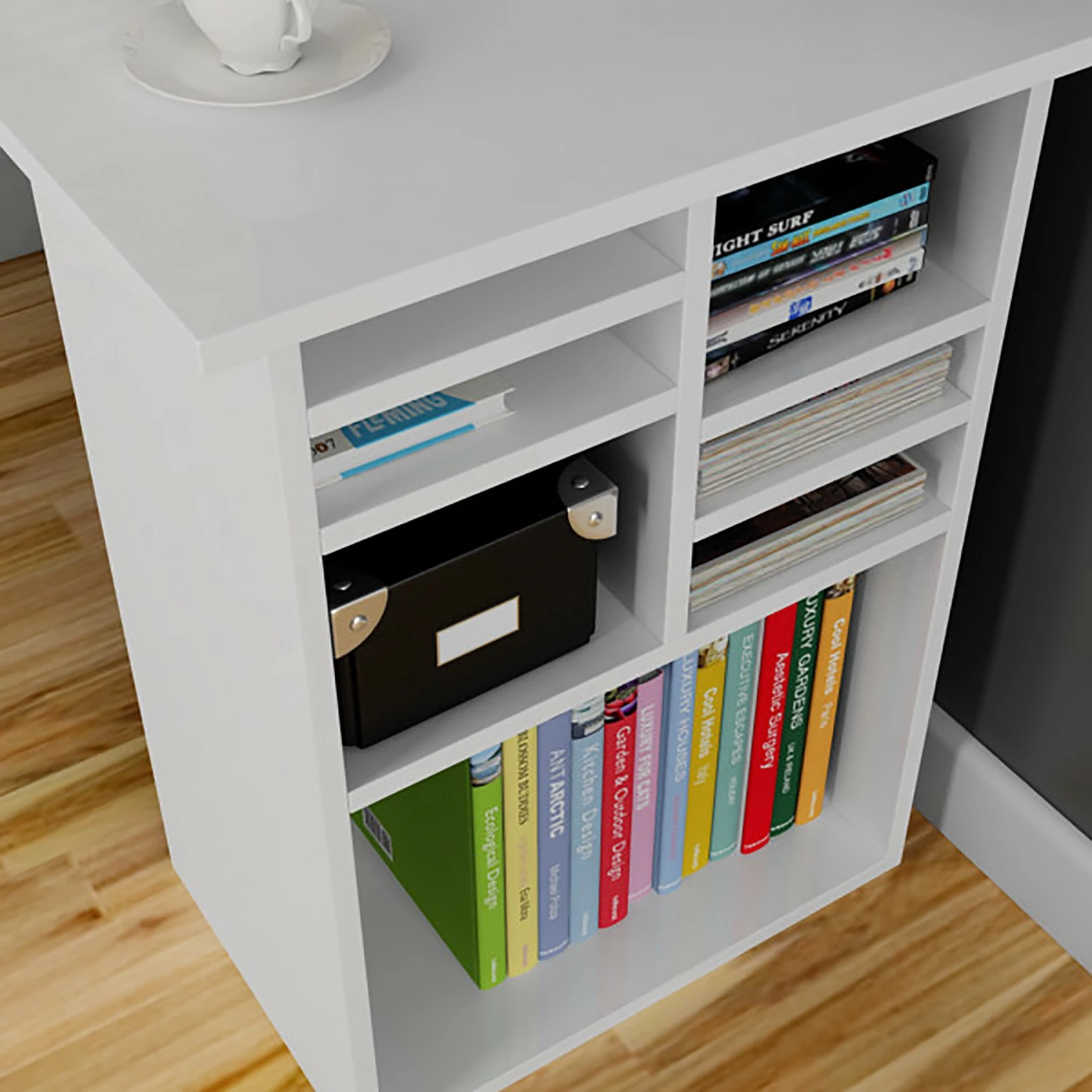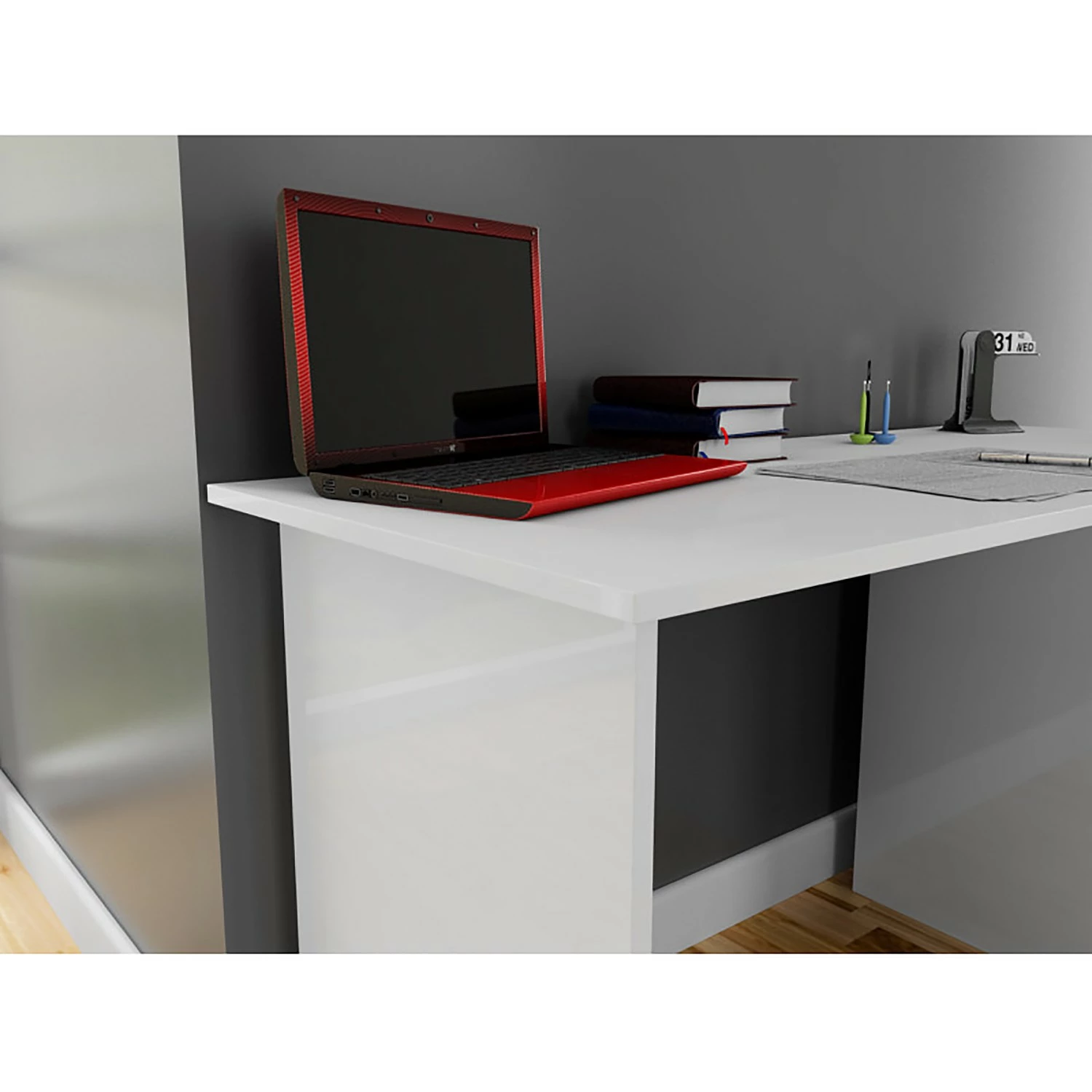 - Tischplatte & Korpus: MDF (Mitteldichte Holzfaserplatte), melaminbeschichtet